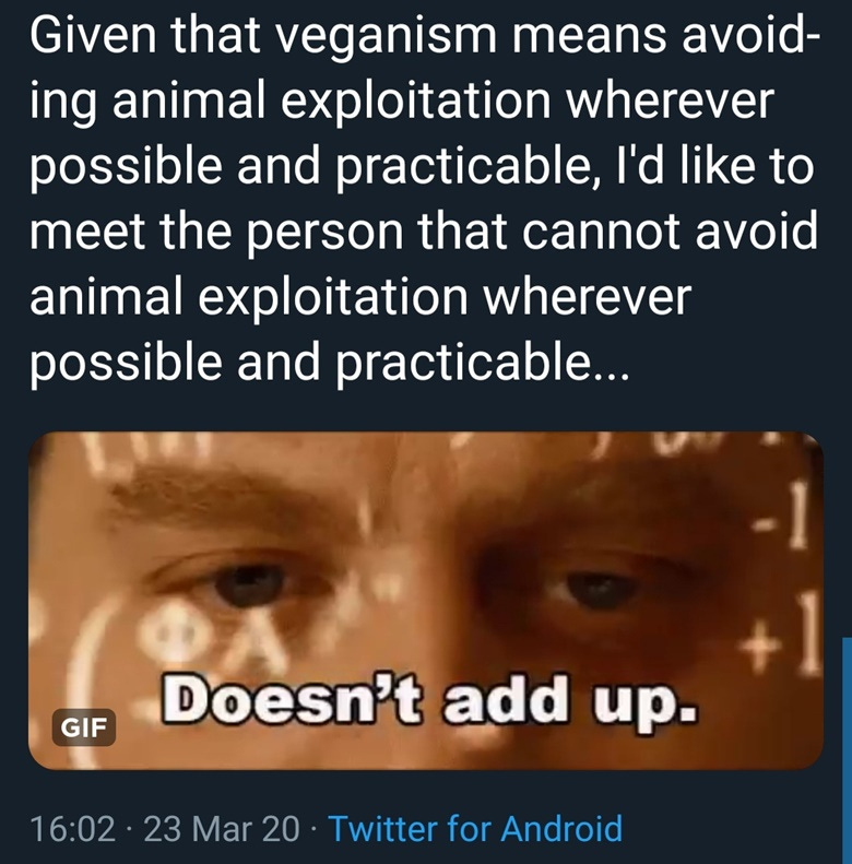As per this definition, every single person on Earth can be vegan since veganism simply means avoiding animal exploitation when it is in your power to do so. Who can't use a choice when they have a choice?